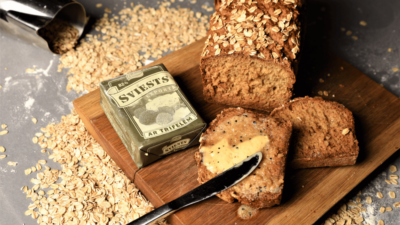 pārkaisa ar sausām auzu pārslām. Liek uzkarsētā cepeškrāsnī un gatavo 60-70 minūtes. Kad maize ir
